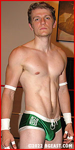"You look just as impressive as The Boss said," says Kayden as he meets his requested opponent. Yet impressive is an undergraduate word to describe Jason Aleqsander. The man is fucking exquisite! With the face of a Hollywood lead, piercing eyes, toned swimmer's build, and hypnotizing bulge in wrestling bikini trunks, Jason clearly captured the attention of many on his arrival at BGE. He stunned with a last-second victory in his very first match, the close contest against Seon Cruz, who was perhaps too entranced with Aleqsander for his own good.
