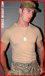 Kayden drops the studly soldier to his knees in worship of his thickly-bulging jock