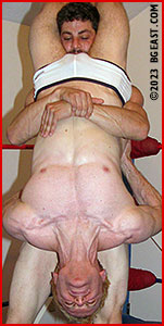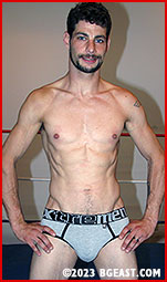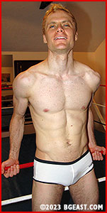 Rocky strips off his sweat pants as he comes through the ropes. "You've got too much energy," Rocky snarls as he strips Wolfboy down to his briefs, "I'm gonna have to beat some of it out of you." He then tears off Wolfboy's T-shirt, only to use the shredded cloth to tie up his hands! And as Rocky continues to torture Wolfboy, moving from one vicious hold to another, he starts enjoying himself. And Wolfboy loves a scrap. Shoving Rocky into the corner, he grabs Rocky's throat with one hand and starts punching those rippled abs. You can almost see the switch turn in his eyes - when he realizes he underestimated Rocky as an opponent and a competitor, and he's going to have a fight on his hands.