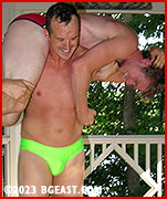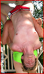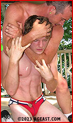 "Nobody better to wrestle than THE Kirk Donahue," Kirk boasts while sizing up the competition. The two men are ready to rumble. Jason dodges a lockup twice, leaving Kirk to hug thin air twice. Kirk grumbles about Jason's "tricks." "I'm not here for any tricks," he says sourly. "I'm here to wrestle." On his third try, Kirk aims low and Jason leaps over his head. Kirk sputters, at a loss for words. Jason leaps again, this time locking his thighs on Kirk's ears and flipping him to the mat. His back to the gazebo balusters, Kirk holds his hands out, urging Jason to step back. Jason moves in, and Kirk butts his head against Aleqsander's chin. Jason falls back, and Kirk commences to stomp on his upper body, abs, waist, and back, as Jason feebly attempts to roll away.