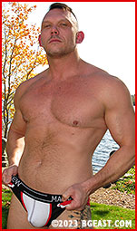 The fight carries both heels around the BGE grounds. They battle on the deck, gradually stripping each other down to their briefs. Jonny literally wipes his butt with Brendan's face. Dirty. Fists fly right and left and up and down. Jonny gets Brendan in a side headlock and marches him to the Wrestleshack. They don't enter, preferring to duke it out against the wall. Brendan slams the door against Jonny's head. Jonny bangs Brendan's head against a tree trunk and chokes him with a rubber hose. Brendan bangs Jonny's forehead against several tree trunks, close to the peaceful lake. They make their way to the gazebo. Brendan uses the abandoned mats to bludgeon Jonny, then bury him. Things will get settled in the gazebo, but it's a long, cruel ordeal.