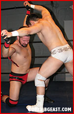 Anton catches glimpses of wrestling glory that may, one day, be in his future. He crushes the air out of Kayden's lungs in a bearhug and shakes the big man like a ragdoll, in a bid to score what would be the biggest upset in recent history. But Kayden is a master of his craft, punching his way to freedom before settling in to dole out sweet, sweet revenge. "You wanna break someone? I'll show you how to break someone!" The heel slaps the pretty right off Anton's face. He pounds the adorable mug into a turnbuckle and then stomps him two dimensional into the mat. "I got a part of me that's pretty freaking muscular too," Kayden points out, snapping his tree trunk thighs around Anton's head and crushing his skull as the rookie pleads for mercy.