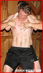 The mats are ready as Freddy pounces, shoving and berating the shocked footie star and provoking a fight. "I see how it is," deadpans the star as they take off their shirts, revealing those killer abs; Freddy's seeing more than red. The two scrap in shorts at first as Freddy shows off his own superior body bending skills, but it's not long before they're only in socks and underwear as Freddy's nelsons, chokes, camel clutch, scissors, and flips allow him to strip off Jason's nice soccer shoes and begin to prove what a babyface loser this prettyboy is in the sport of wrestling.