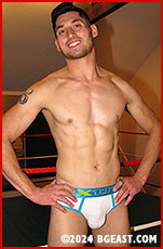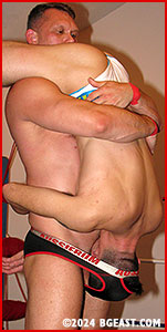 Fifteen years ago, no one would have to thought Brendan Byers would ever headline a match in BG East's Ultra Heels series. Well, at least headlining as the 'heel'! After his unluckily rough run as the perfect ever-jobber and a lengthy sabbatical that saw his underground experience - and muscles - blossom, Byers has returned 100% burlier and 200% meaner, and his vengance tinged with pleasure brings him fully now into the BG East's ultraheel ranks. Oh, what pent-up frustration can do to a man! He invites his victim - ahem, we mean opponent - the stunningly sexy Kal Connors to enter the ring, like him in sexy undergear.