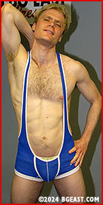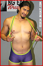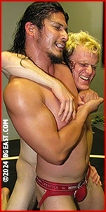 The first peel-off is voluntary, as they remove their street clothes to reveal extremely low-cut singlets that tease at layers underneath. But after that, nothing comes off without a hot, sexy, hard-earned submission. The long haired Latin behemoth is quickly humbled by the wiry blond grappler, who has him stretched, submitted and slowly stripped of his singlet in less than two minutes. Zach struggles to use his raw power to control scrappy Rocky in round 2, grappling his opponent into an even meaner, back stretch submission, to even things out.