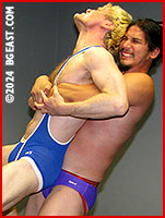 Zach refuses to go down to the much smaller blond and cranks him a ball-clawing inverted headlock