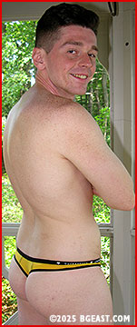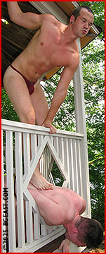 Kirk and Freddy peel off their outer gear, leaving them in only G-strings. Now let the butter butt win! Kirk is the more adept of the two, especially at weaponizing the gazebo, inside or outside, using the railing to inflict pain and humiliation, butt-slaps and more. The last half of the match is a slaughterhouse. Sweat is everywhere, but especially on Donahue, who looks his best when his baby-smooth body is covered with sweat and slap marks. He mutters a slow 10-count, then presses his crotch down on the face of a now unconscious Freddy. When he stands, he shows off his butt, letting his slap marks and bruises fill the screen.