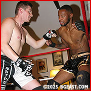 Freddy Campbell was up for some of what his boyfriend Ash got while sparring with Seon on the last Gloved Gladiators. Freddy's here making his boxing/wrestling hybrid debut, also in shorts and fight gloves. Seon doesn't even acknowledge getting Fred's invitation, but geared up, he's more than ready to go when Freddy taunts and admires his hot outfit. Stiff shoves lead to spirited aggression, as the two spar in a standing punchout. Freddy rains blows till Seon hits the corner but Seon sucks up the pain, reverses the heavier man, and lays in stiff shots to Freddy's midsection while shoving his bicep in Freddy's face. It's just the beginning of this test of abs and bodies. Draped over the ropes, relentless blows try to prove which wrestler's midsection can take the most punishment before he's forced to submit.