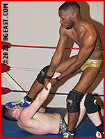 Often looking ready to pass out from a gut shot barrage, these two manage to strip each other to shiny trunks and undergear as the action moves from sudden devastating falls to crotch-to-face mounts, headscissors and pins. Chokes, big slams and suplexes, and Freddy's floating octopus hold put Seon's muscled physique through the wringer - but he keeps coming back for more. Seon gets wedgied but Freddy's butt-revealing underwear show off his bodacious butt as the gloves come off, the sweat increases and low blows proliferate! Back and forth humiliation from boots, crotches, and giant knockout moves bring this match clearly into the realm of BGE pro wrestling! A humbling knock-out brings the action to a climactic close for one of these two sparring superfans.