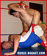 Brendan's musky bulge smothers and subdues Lobo in a crotch-clawing reverse schoolboy pin