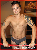 Ash DeLeon is always magnanimous. This affable heel has brought his bubble-butt boyfriend Freddy a gift as they meet in the gazebo on a spring day: a brand new training dummy, recruited as much for his irresistable cuteness "in the locker room" as for his super-jobber reputation. Damian Pike is as eager to learn from Master Ash as Ash's budding-heel partner Freddy. Damian may just have been lurking in the BG East locker room for just that purpose; his matches at BG East have showed a shockingly erotic mix of biting off too much (as with setting his sites on superstar Kayden Keller while he was still a lowly rookie) to wallowing in sensual suffering even as he battles back (as with his fight against Forrest Taylor to see who would make the other his bitch in this very same location!). Erotic domination class is in session!