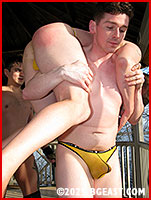 Freddy appreciates the gift as he dutifully learns from Ash's instructions in the finer points of dominating this 'dummy' Damien, but can't help but notice that Ash is more than willing to savor Damian (rather than him) whenever Freddy fails Ash's tests! Ash instructs gifted Damian to help Ash punish his boyfriend for failures, or just because he wants to see what Damian can do. Damian's learning a thing or two. One thing is that Freddy's thong tents easily when it takes a beating from angry Ash. Another is that he can cop a feel on that bulge without suffering any revenge.