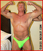 Whatever Ben thought this motel match would be like, he's absolutely picked apart like a turkey dinner. Ace looks like he's planning to feast on a drumstick as he wrenches on a single leg crab. "You stupid bitch," Ace spits in contempt. "I'm going to break your stupid little leg!" Ben sucks up the punishment like a sponge, furiously insisting that any minute he's going to turn this around and catapult the vicious pro wrestler through the ceiling. His mouth keeps saying that he's furious, that every insult and injury is fueling his determination to reclaim his stolen dignity by beating it out of Ace. But when Ace rips Ben's board shorts off, stripping the muscle man to a very skimpy lime thong, big Ben's gargantuan cock threatening to squirm out of its pouch tells an entirely different story.