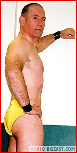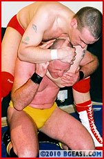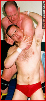 Excalibur was the masked hottie from Britbouts 7, but after losing that match to lycra-king Cyclone, he has been demasked to become simply 'Excalibur Norris'. Still, he's taking his defeat in stride and bringing the tenacity and eagerness for erotic flourishes to bear on his new opponent, rough and ready Dave King.