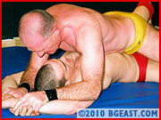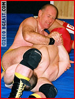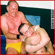 Both appear in spectacular pro gear: Dave in red trunks, pads and red/white boots with his initials; Norris in yellow trunks, black & yellow boots. These guys are even matched in size and skill and the battle is aggressive and horny with lots of intense holds and blows. Hot face-sitting, jap strangle hold, even slams, ball-grabbing, boot on the face, wedgies, hard-ons, forearms, hammers, scissors, headlocks, and gut-busting. What a menu! Incredibly sexy with a prolonged sleeper finish. Very horny!