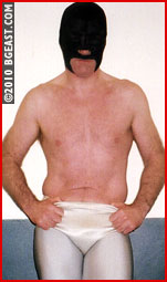 Excalibur's tights and trunks are a shiny, stretchy, sexy silver. Cyclone's pouch shines and threatens as they take turns burying their opponents faces in their 'gear' as the action see-saws and their agony is demonstrated in iconic submission holds. This is a great give and take bout culminating in a battle of the drawstrings as each masked man tries to de-mask the other. Ultimately, one masked man walks off with his opponent's mask tucked inside his trunks as his trophy! Pro glory galore!