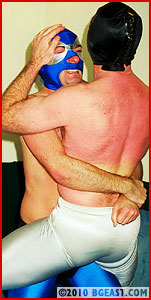 For those of you into masks and lycra, get ready! Here are 2 hairy-chested masked Brit-heels with shiny, packed pouches and spandexed legs all entwined in hot figure 4 leglocks, hot sweaty masks between hot sweaty spandex-covered thighs, masks to the crotch and masks to the mat. Cyclone wears brief shiny black trunks over his bright blue tights. (Some of you may already be familiar with Cyclone from his very impressive and creative wrestling-superhero website "The Eye of the Cyclone")