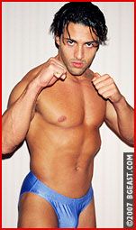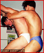 Greg's martial arts elicit mockery from superhung Jose, who challenges the hunk to hard pro action. Greg, in white bikini & boots, takes charge until barefoot Jose goes for his big pecs. Jose claws, pounds, and stomps them til Greg submits in agony. Jose tries to finish him off, but a big DDT gives Greg the equalizer. Trunks off, rockhard and nude, they battle to a ballbusting, pecpounding submission to end this sizzling opener to this very popular series' awaited return!