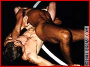 Sombo star Andy initiates game Afro-stud rookie to his special abuse. Body/head scissors, endless leg splits: cocky Andy's metallic trunks show off muscled buns; Dan's grey bikini packs a pouch! Andy ball grabs, strips and chokes Dan with his own bikini! Long bareassed final fall leaves the winner humping the loser, applying mouth to mouth in long sweaty sensual finish.
