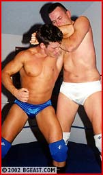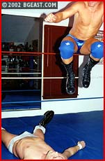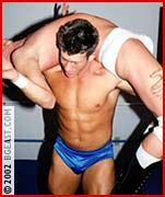 It looks like a classic pro squash waiting to happen. JJ Hart in eye-popping, packed-pouch white pro trunks. Nick in blue satin. Think Kenny Kendall vs Kevin Sullivan, Bob Emory vs Dirty Dick Slater. But Nick's tougher than any prettyboy has a right to be, with a darkside mean streak and enough skill to turn even a simple hold into a devastating power move. A headlock turns into a tornado ddt. A crushing figure 4 head scissors toys with JJ's consciousness. A torture rack forces an immediate screaming submission, but Nick makes it even worse - spinning faster and faster as JJ begs for mercy, only to release him and send him crashing to the mat. "You're a waste of my time!" Nick rants, as JJ grovels on the mat in agony. He begins to leave the ring in disgust, but suddenly changes his mind...
