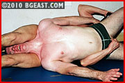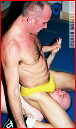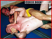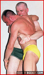 Sexy Dane is the Brit x-fights champ and tough skinhead Jim proved he can take whatever his opponents dish out. Dane sports a big bulge in his yellow speedo. Jim wears tight army-issue briefs. Rough aggressive mat action is the key here. Intense grappling with killer headscissors, headlocks, lots of face-to-crotch scissors and pins, brutal ballgrabbing, face sitting, nudity, more! Dane won a gold medal at last summer's Games in Amsterdam and has been called "Europe's Sexiest Wrestler". We do not disagree!