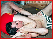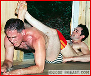 Scottish lad Ian arrives dressed for battle in his kilt, or "skirt" as newly buffed Keith remarks. Both their butts look great in squarecuts in the natural light of the shed. The aggression explodes as hairy-chested Keith uses his muscleweight advantage to control the Scot. Bodyscissors, jackknife pins, relentless headscissors. Back'n' forth submissions: legsplits, headscissors, more. Face and butt slapping humiliation drives this match to its surprising finish as the loser follows the winner back into the woods. Terrific action, lots of aggro!