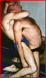 Starting off in street clothes, Dane and tattooed, street-tough Mickey face off in our London matroom. When the shirts come off, Mick's ripped body is nothing short of astounding. The rough action includes chokes, face-sitting, headscissors, grapevines, jacknife pins -- and a full nelson shows off Mick's ultra-shredded abs. Man-to-man kissing, bare feet in face, ballgrabbing, and knees to the gut punctuate this macho match. Stripped nude, Dane sits on Mickey's face, traps his arms, and goes to work on pounding those amazing abs into submission. As the studs fight for top-dog position, armpits are kissed and cocks are sucked. Another incredible bout for guys who like their wrestling rough and raunchy!!!