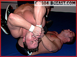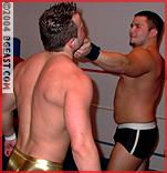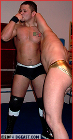 At BGE action is the main course, but nothing seasons a meaty match like a big dash of trash talking spice. As such, we present three matches celebrating our mouthiest personalities. Muscleboy Kieran has yet to win a match, but after savoring the thrill of dishing out a beating on his former partner Josh Goodman in Tag Team Torture 6 and topping a recent internet poll as "Favorite Muscleboy," in his mind he's the best thing going. "Prepare to be amazed," he cautions before ripping off his slacks to display a gold bikini that should be marketed under the label, "PermaWedgie." "I've got gifts you can only dream of." But to beefy-built Jerry, wrestling isn't a beauty contest. He forces the "prettyboy" to dance on tiptoe during a finger wrenching test of strength, until the cocky cutie rolls back and wraps his ankles around his throat. "Get ready to fly, fat boy," Kieran promises, but torque, turn--the big boy not only doesn't go down but twists Kieran into a Boston crab instead! (continued...)