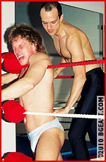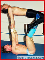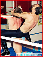Vicious long had his sights set on musclepro Bryan. Bryan is the king of BGEast style babyface action, with unmatched pro wrestling training, a powerful muscled physique, and a will to fight on and to take all comers (!). Vicious took note of Bryan's erotic encounters, but he took more pleasure thinking of how he could destroy this BGEast musclepro's muscles, bending and controlling him, than any post-match excitement. Bryan for his part was tired of lightweight heels under Kid Leopard's tutelage taking over BGEast's ring delivering insane beatings on his friends.