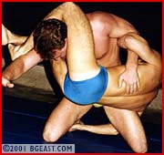 "I want that big one," Bass said. That big one is 26, 6'1, 190 lb beefy blonde hunk Luke, no stranger to wrestling but new to submission - exactly what crafty Bass was counting on. They grapple cautiously, testing each other, but soon Bass is scissoring, stretching, even spanking Luke. Great crotch viewing, especially as Bass splits Luke's legs wide. Covered with sweat, the weakened, tortured hunk is forced to admit he can resist no more. A humiliating finale, especially if you like seeing big muscle-boys get humbled.
