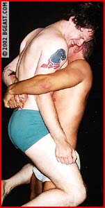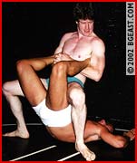 To say Jarrett Cole gets off on punishing his opponents is an understatement. He LIVES for it! Jarrett lures his new and very handsome opponent into the dark and steamy BGE matroom and then attacks him from behind and strips him down to his sexy white squarecut. Poor Paul never has a chance as Jarrett unloads on the newbie with a brutal combination of pro and submission style moves - otk backbreakers, flying elbows, long-held crotch-to-face headscissors and more! Jarrett's been training under Kid Leopard and it shows! There's no ambiguity about his style: rough heel! Paul fights back as best he can, but Jarrett is too turned on to slow down, scoring submission after submission until Paul can barely move. As a salacious finale, Jarrett strips down to hump the beaten prettyboy's face with his rigid rod before pumping off a gusher of a cumshot on his battered body. Hot! Great action & holds!