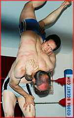 Shon's height advantage and chiseled jaw line are misleading. Inside this strong man is a jobber begging for a beating. Heel Jarret knows it, nonchalantly telling the hairy-chested hunk "I'm gonna kick your ass," after some mouth-watering posing. The tattooed tough has no trouble tossing the bigger man around, scooping him repeatedly for all sorts of bodyslamming punishment. Seems Shon is ripe for Jarret's infamous post-match erotic humiliation. Outside a few short-lived reversals, this is total domination on the screaming Shon, as he's gut-punched in headscissors or choked in sleeper holds, his attacker sensually humping him at every opportunity. Jarret keeps tempting Shon with flashes of his thick manhood, luring the dazed victim into all sorts of delicious rope and corner torture. Each time he yanks Shon up (by the hair, asscrack or balls), Jarret just gets harder, and before long, these men are bound to explode in pent-up frenzy...